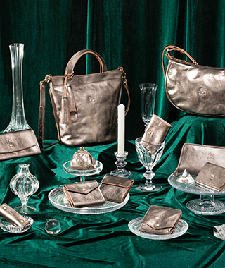 今年のイル ビゾンテのウインターギフトコレクションは、リッチで華やかなブロンズレザーを採用。この時期だけのスペシャルカラーのきらめきが、幸せに満ちたひとときを盛り上げます。デザインはバッグからスモールレザーグッズまで、人気モデルの数々をセレクト。